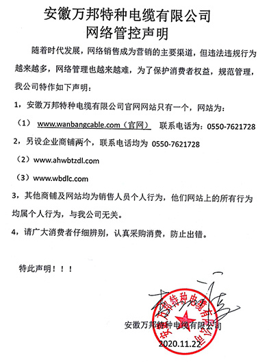 鄭重聲明:安徽萬邦特種電纜有限公司官方網站為:www_wanbangcable_com.kaobangshou.com,除此之外無任何子網站或合作網站,其余均為假冒偽劣。電話:0550-7621728 13485756353 地 址:安徽省天長市滁州高新技術產業開發區經四路29號